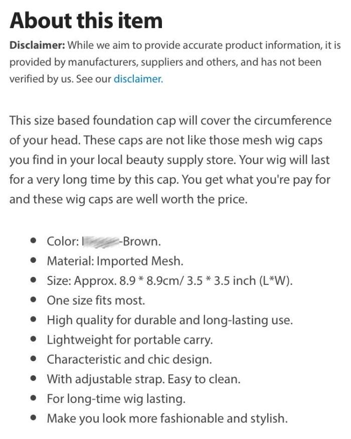 The product is a wig cap, used as a protective layer between a person’s hair and sewn-in hair extensions. The description identified one of the available colors as “N****r Brown.”